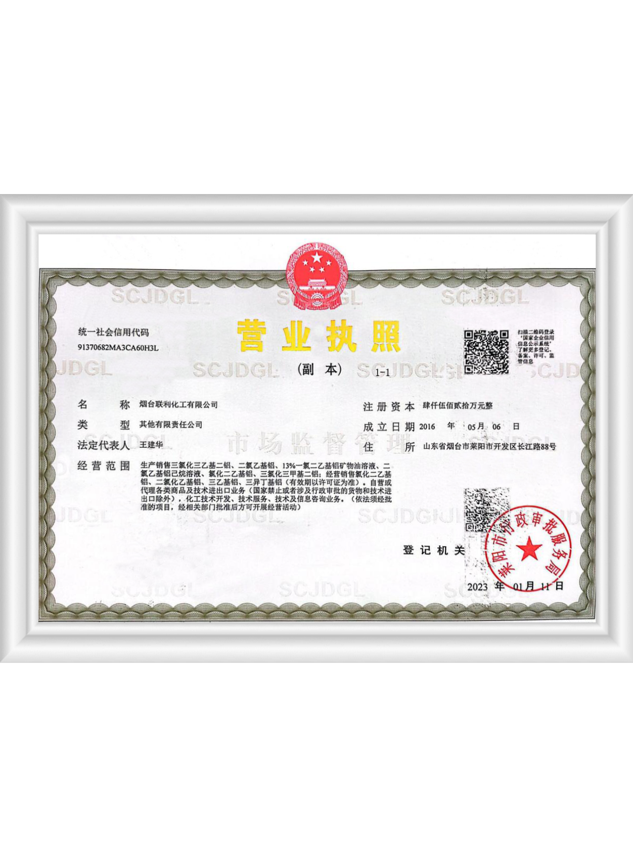 煙臺聯利化工有限公司成立于2016年5月,位于煙臺市萊陽經濟開發區長江路88號,公司前身為1988年北京燕山石化公司技術轉讓成立的煙臺燕德化工有限公司。